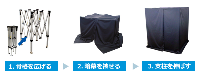 【手順2】フレームを広げきったら暗幕を被せます。(作業時間:2分)